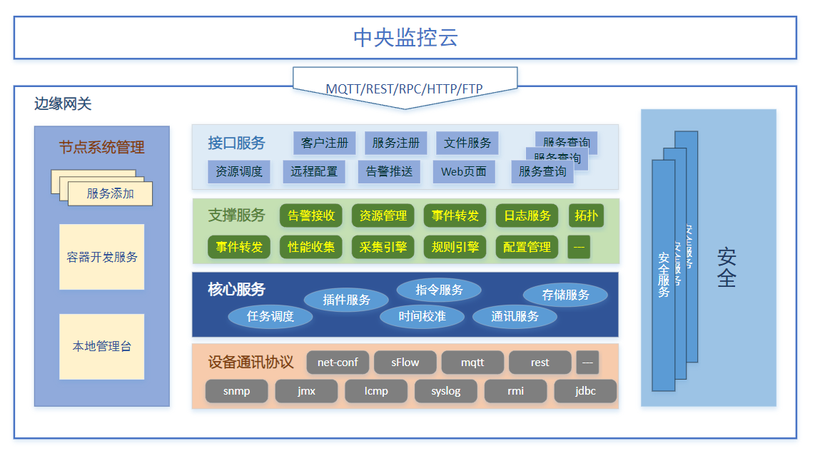 地鐵綜合監控系統ISCS的網(wǎng)管平臺如下圖所示,包括邊緣監控網(wǎng)關(guān)和中央監控云(平臺)。此次測試主要實(shí)現邊緣側監控平臺,具體實(shí)現與各類(lèi)被監控設備的對接和網(wǎng)絡(luò )拓撲的狀態(tài)監控。